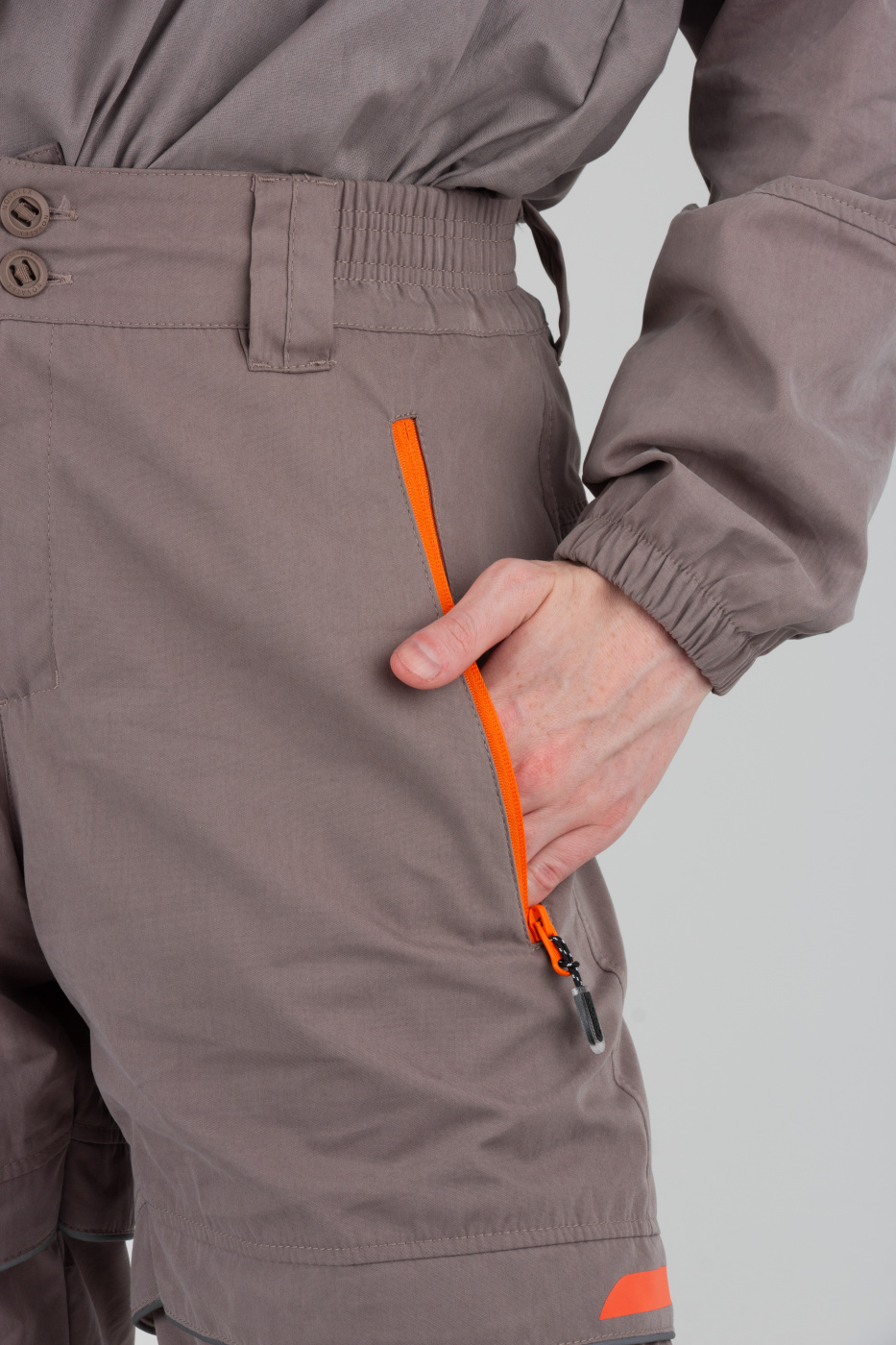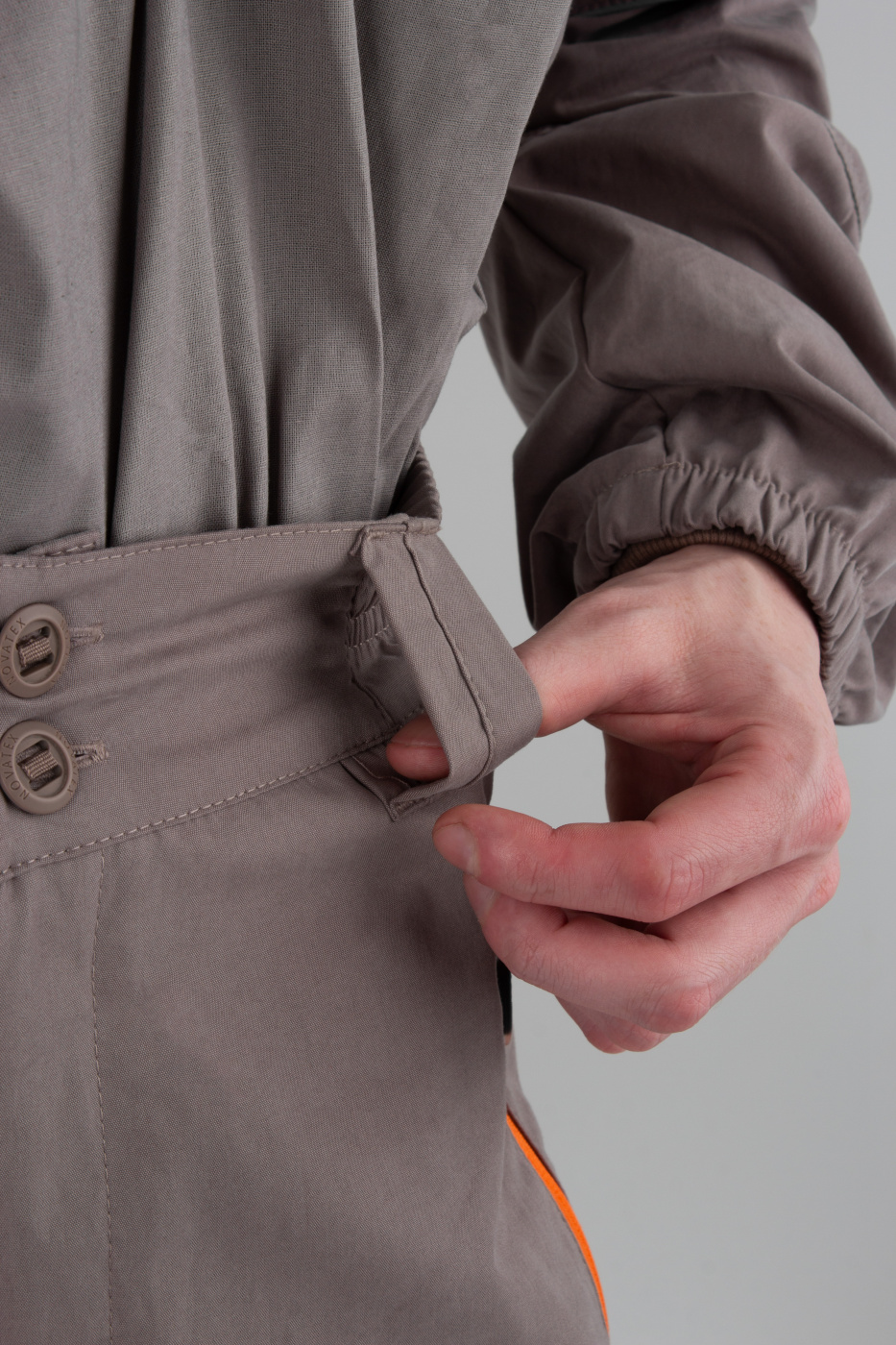 Брюки также отличаются продуманным дизайном. Эластичный пояс с шлевками и внутренней утяжкой на шнурке гарантирует идеальную посадку. Колени брюк усилены для дополнительной прочности. Низ брюк собран на резинку, что обеспечивает дополнительный комфорт во время движения. Два боковых кармана без застежки дополняют функциональность модели. Внутренние манжеты на штрипках позволяют заправлять брюки в ботинки для максимальной защиты.